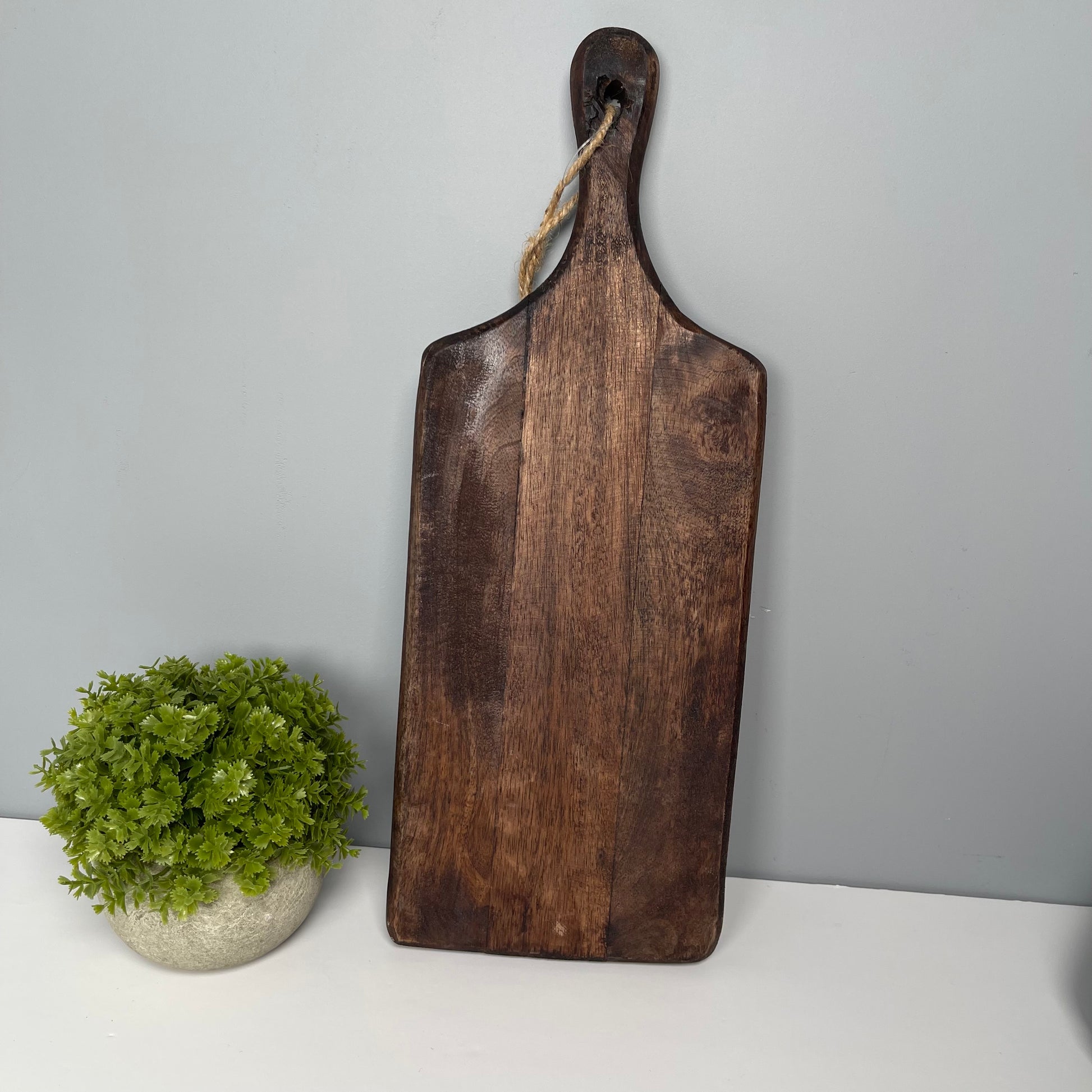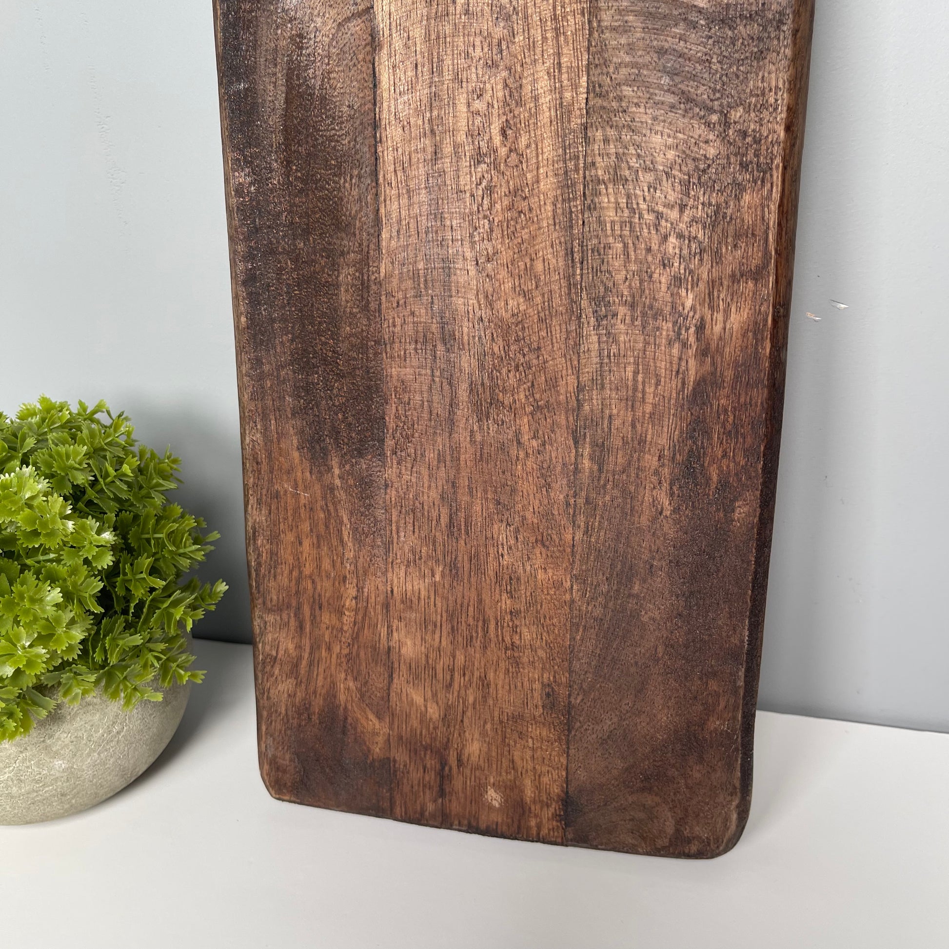 This rectangle-shaped chopping board is made from mango wood, giving it unique dark tones. Its practical design and stylish look make it ideal for kitchen styling, providing you with a perfect centerpiece for meal preparation and serving. Let this piece set the tone for your kitchen interior.