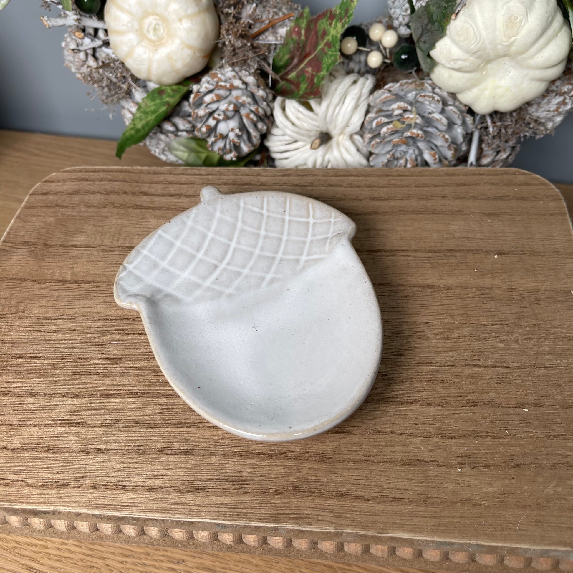 These chic ceramic acorn dish is a warm neutral hue that is detailed with a rustic finish and subtle speckled glaze.